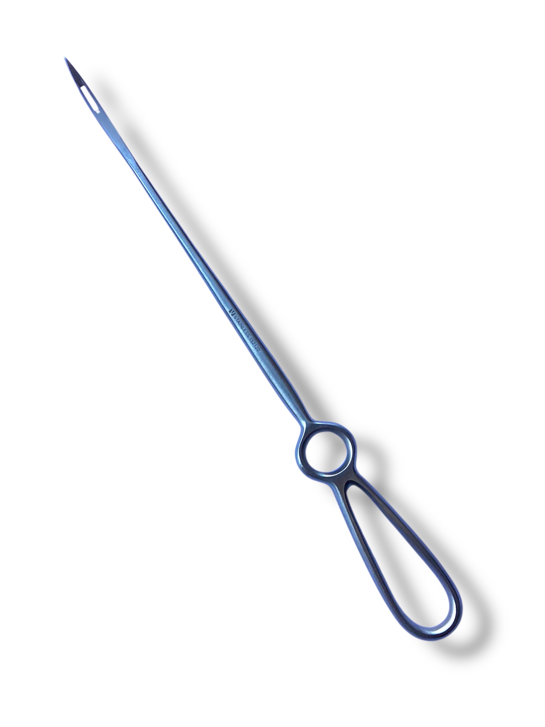 Aguja de sutura Buhner de 30 cm, utilizada en procedimientos obstétricos.