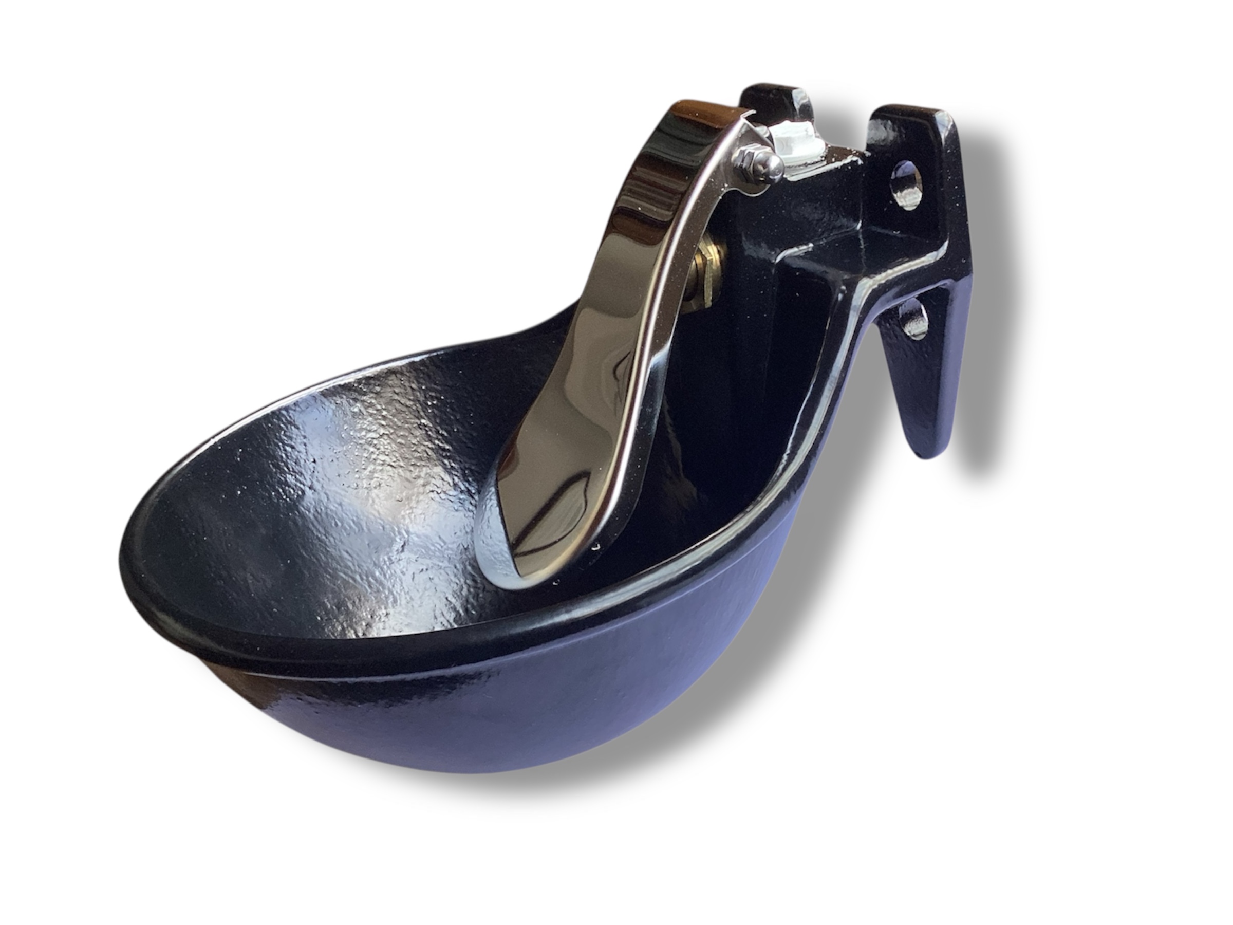 Bebedero automático tipo tazón, fabricado en metal recubierto en color negro.