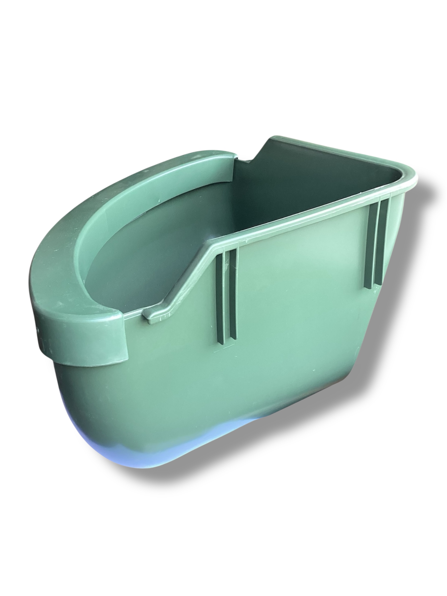 Comedero plástico de 31 litros, diseñado para colocación en esquinas de corrales o pesebreras. Facilita el suministro de alimento