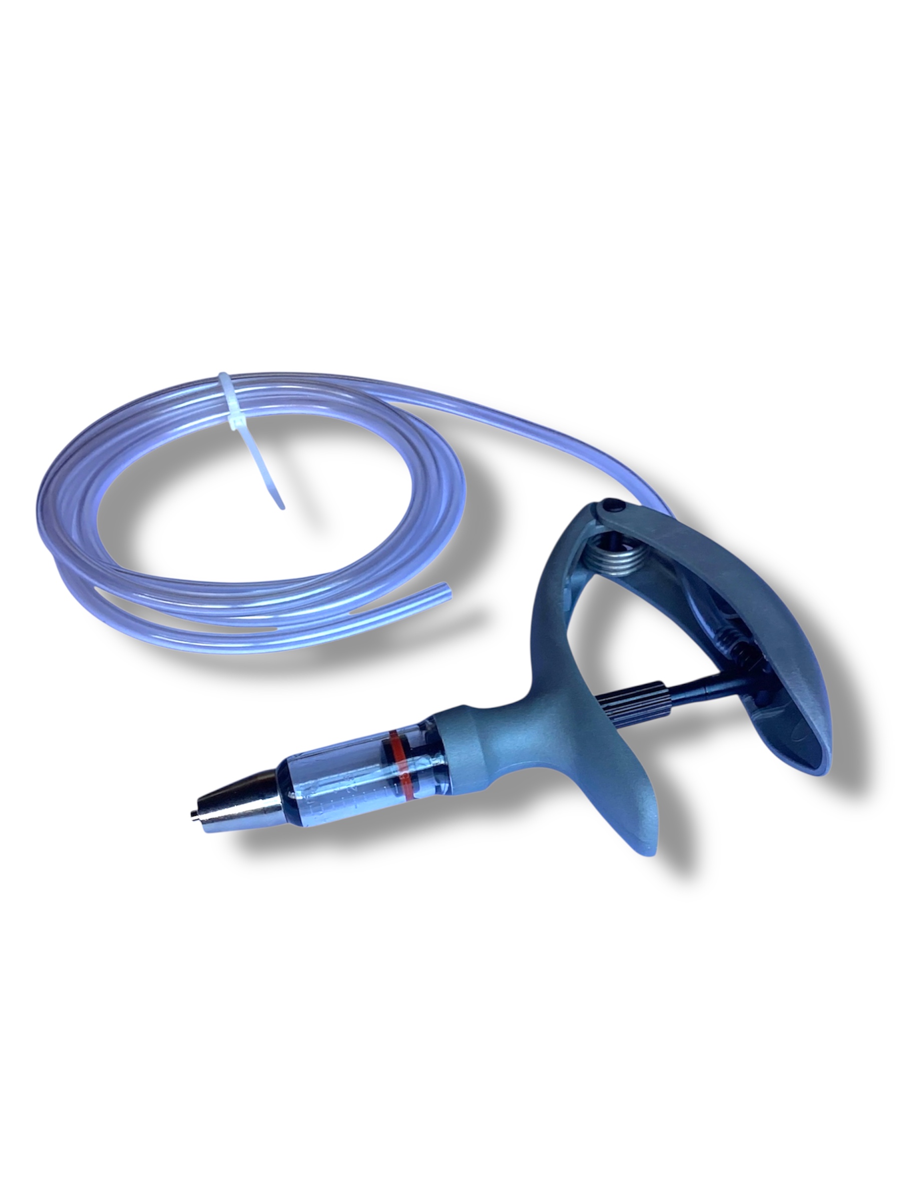 Jeringa veterinaria automática de 5 ml, equipada con sonda para aplicaciones directas. Diseñada para la dosificación precisa y repetida de vacunas, medicamentos o soluciones, reduce el tiempo de aplicación y mejora la eficiencia en faenas de campo.