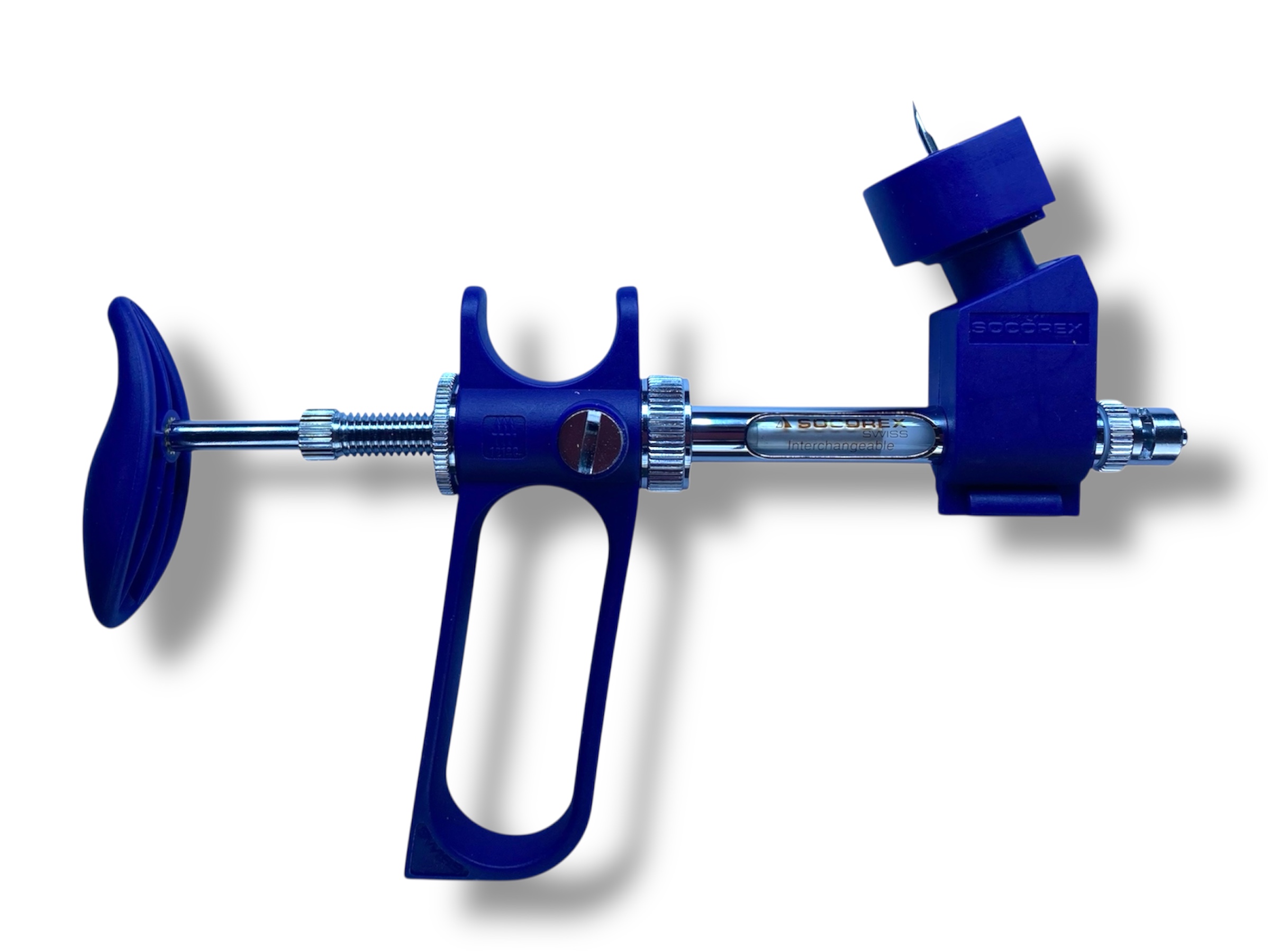 Jeringa automática de precisión Socorex, volumen fijo de 0,5 ml por aplicación. Diseñada para la dosificación repetitiva de medicamentos en animales, con sistema Luer Lock que asegura una conexión firme y segura con agujas y equipos complementarios. Fabricada en materiales de alta durabilidad y resistencia a productos químicos, fácil de desmontar para limpieza y esterilización.
