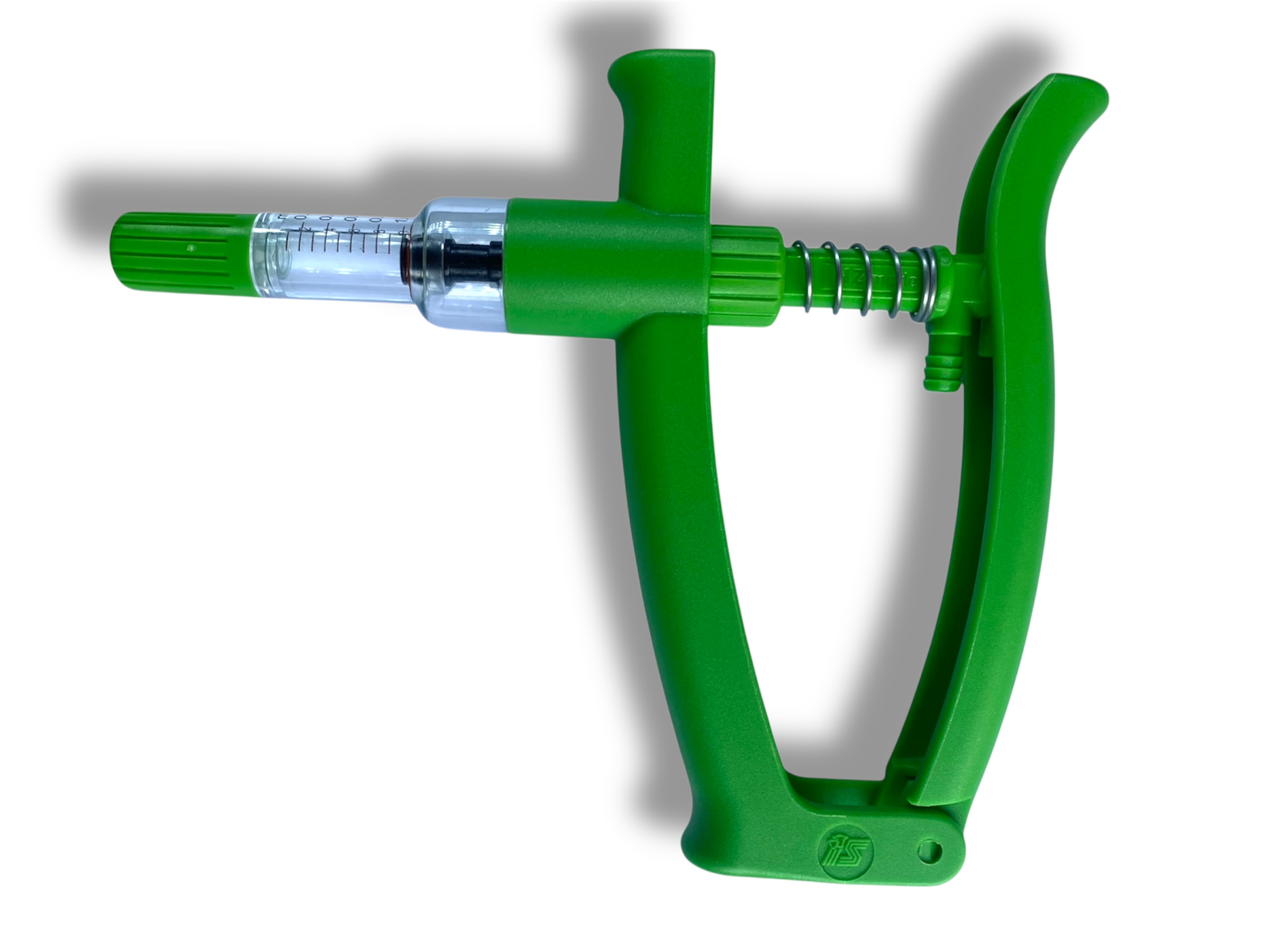 Jeringa dosificadora Vaximate de 1,0 ml, en forma V, diseñada para la administración precisa de vacunas y medicamentos en animales menores o dosis de bajo volumen. Fabricada en materiales resistentes al desgaste, con cuerpo transparente para el control visual de la dosis. Cuenta con mecanismo de recarga automática, sistema de dosificación fija, y conexión Luer Lock, lo que garantiza seguridad, precisión y facilidad de uso en aplicaciones veterinarias.