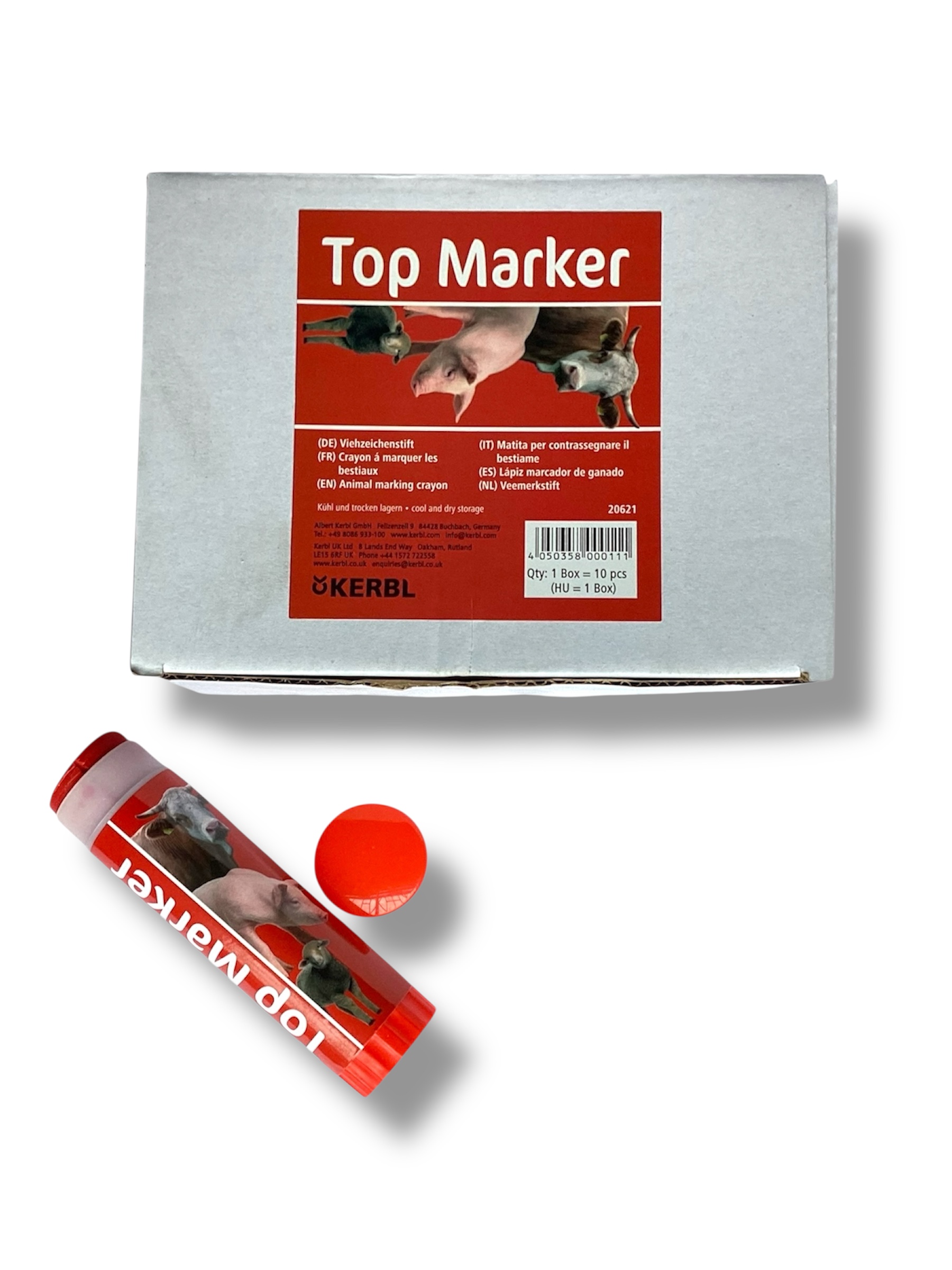 Lápiz marcador Top Marker rojo para ganado. Tinta visible, resistente y duradera en condiciones de campo.