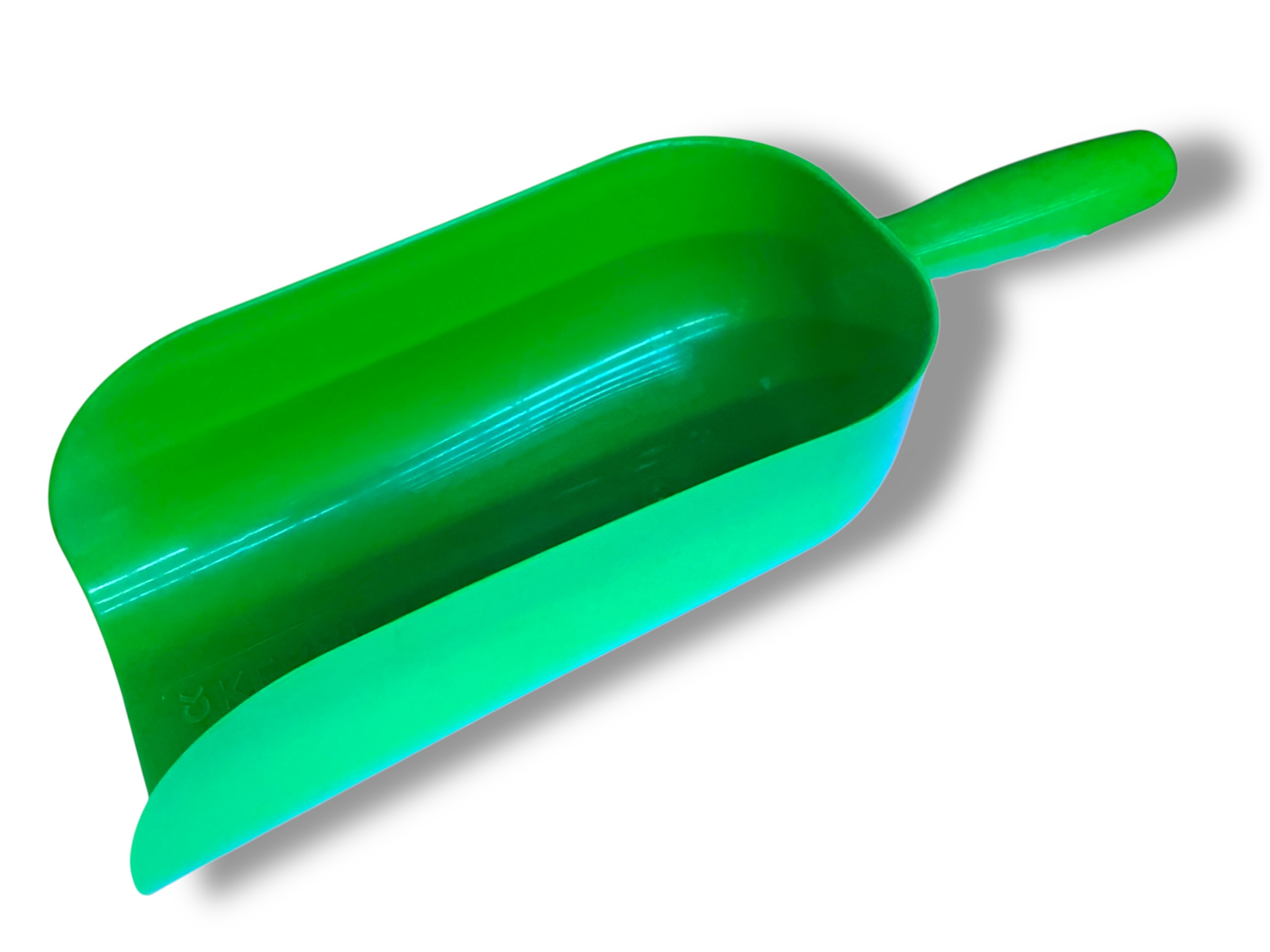 Herramienta plástica tipo pala manual, utilizada en lecherías, criaderos y corrales para el manejo de granos, alimento balanceado o limpieza de residuos