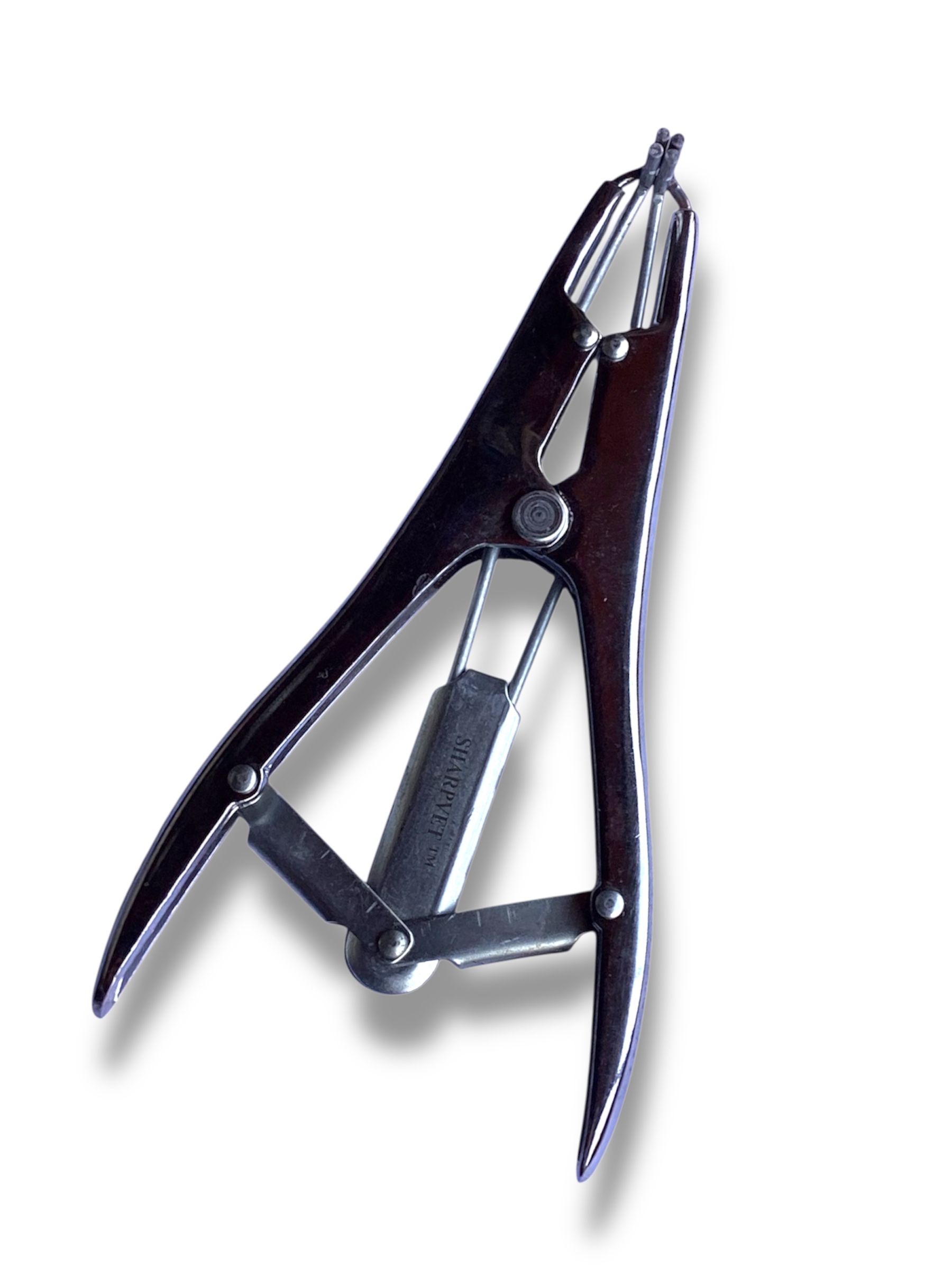 Herramienta veterinaria utilizada en procedimientos de castración y amputación de colas. Su diseño permite la colocación segura y controlada de anillos elásticos, reduciendo el estrés del animal y optimizando la eficiencia del procedimiento. Fabricada en acero de alta resistencia, ofrece durabilidad y fácil esterilización.